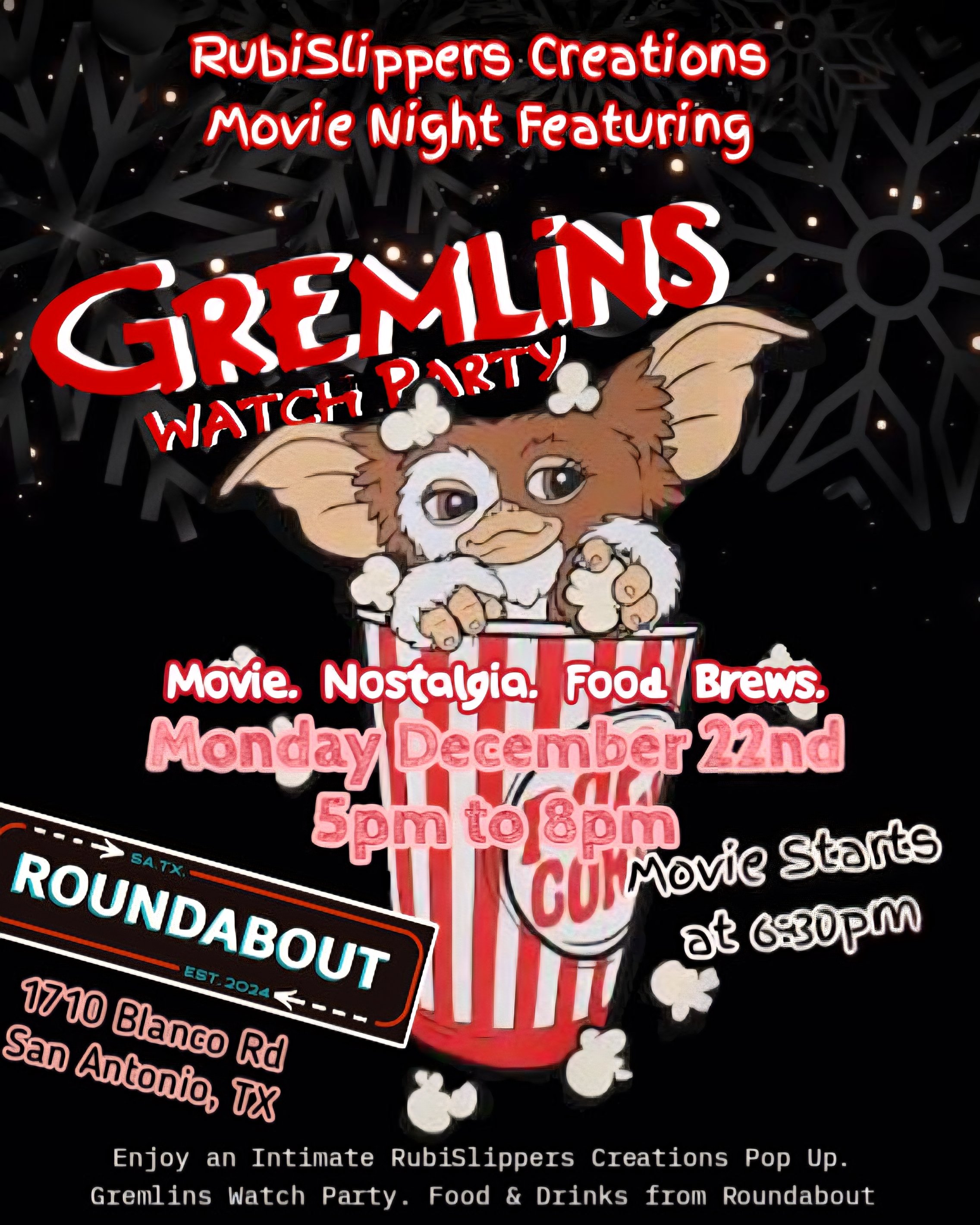 Gremlins Watch Party! Come all ye faithful to Roundabout for an evening of Nostalgia, yummy bites, good beer, and great vibes! Also my Intimate RubiSlippers Creations Pop Up, for the perfect chance to grab those meaningful Last Minute Holiday Gifts.