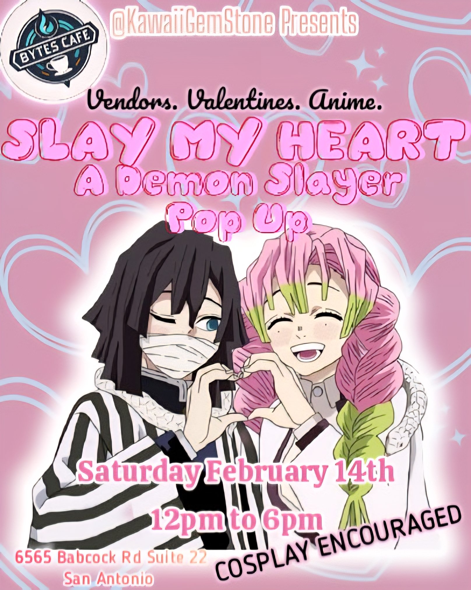 Celebrate Love with us and Slay my Heart! Come and enjoy our Demon Slayer inspired Pop up with Specialty Drinks from Bytes, shop local vendors supplying all your fandom and Valentine needs! We will be playing Demon Slayer episodes, and enjoying all the love in the air for one of our favorite Anime!