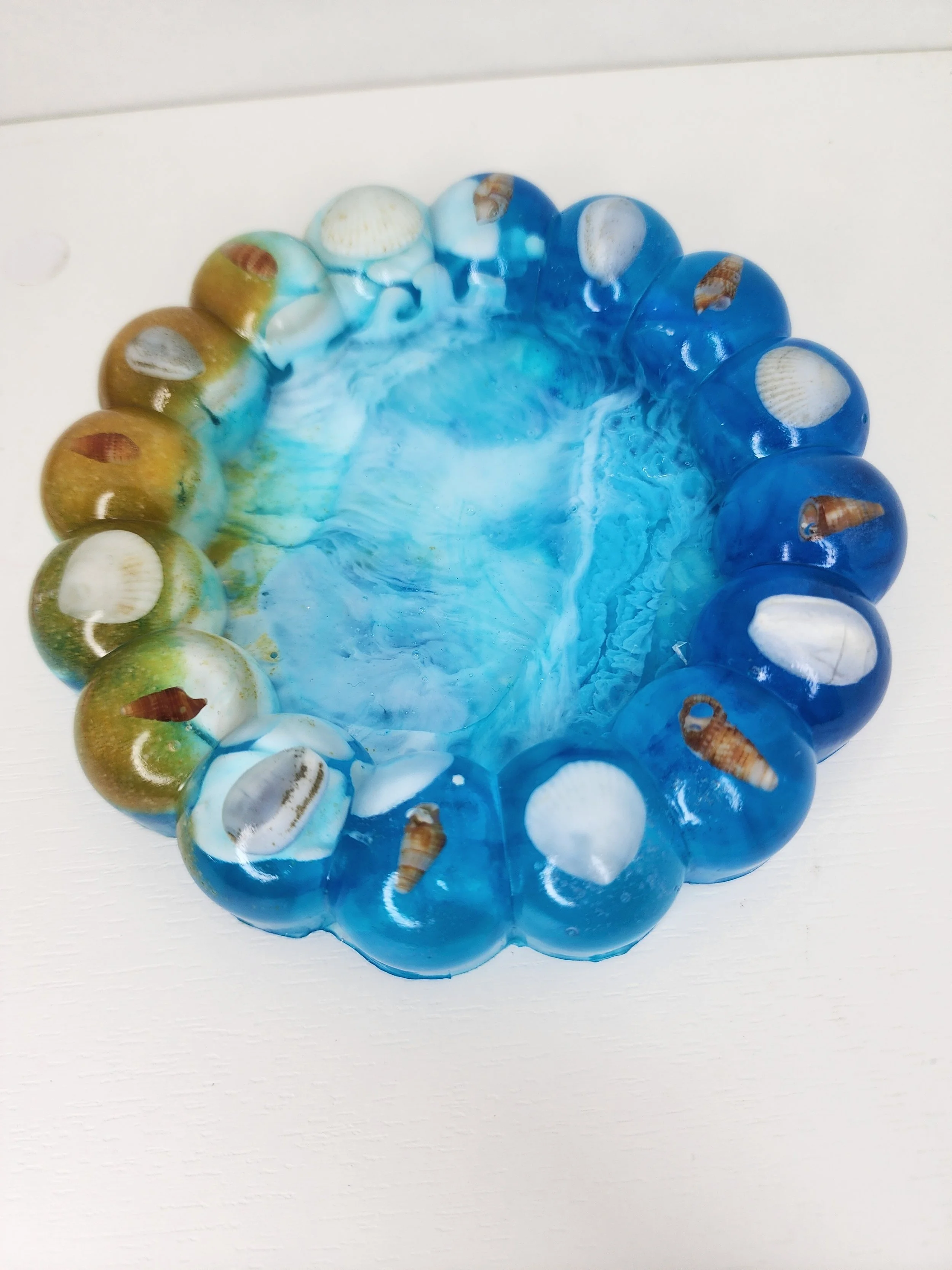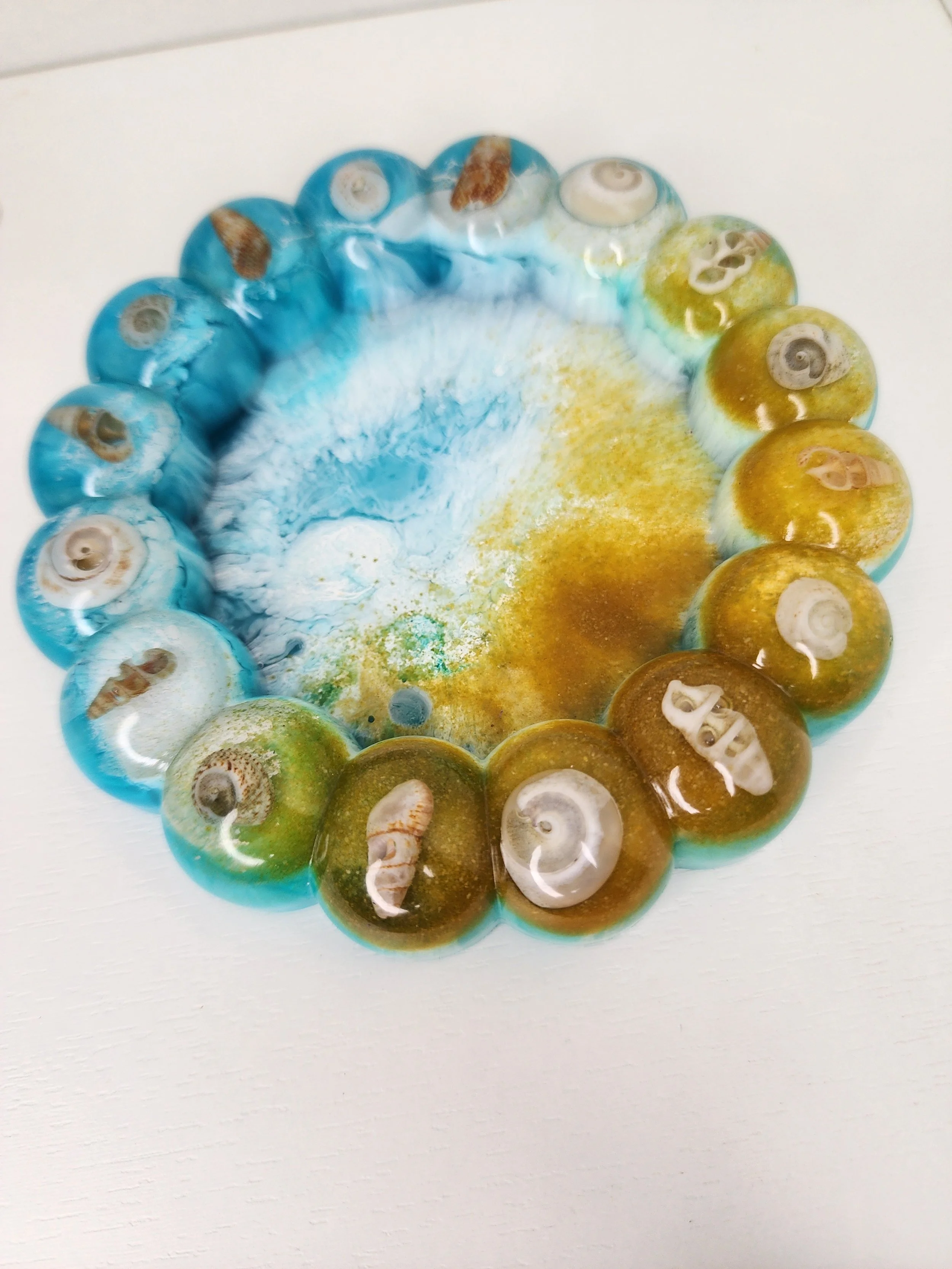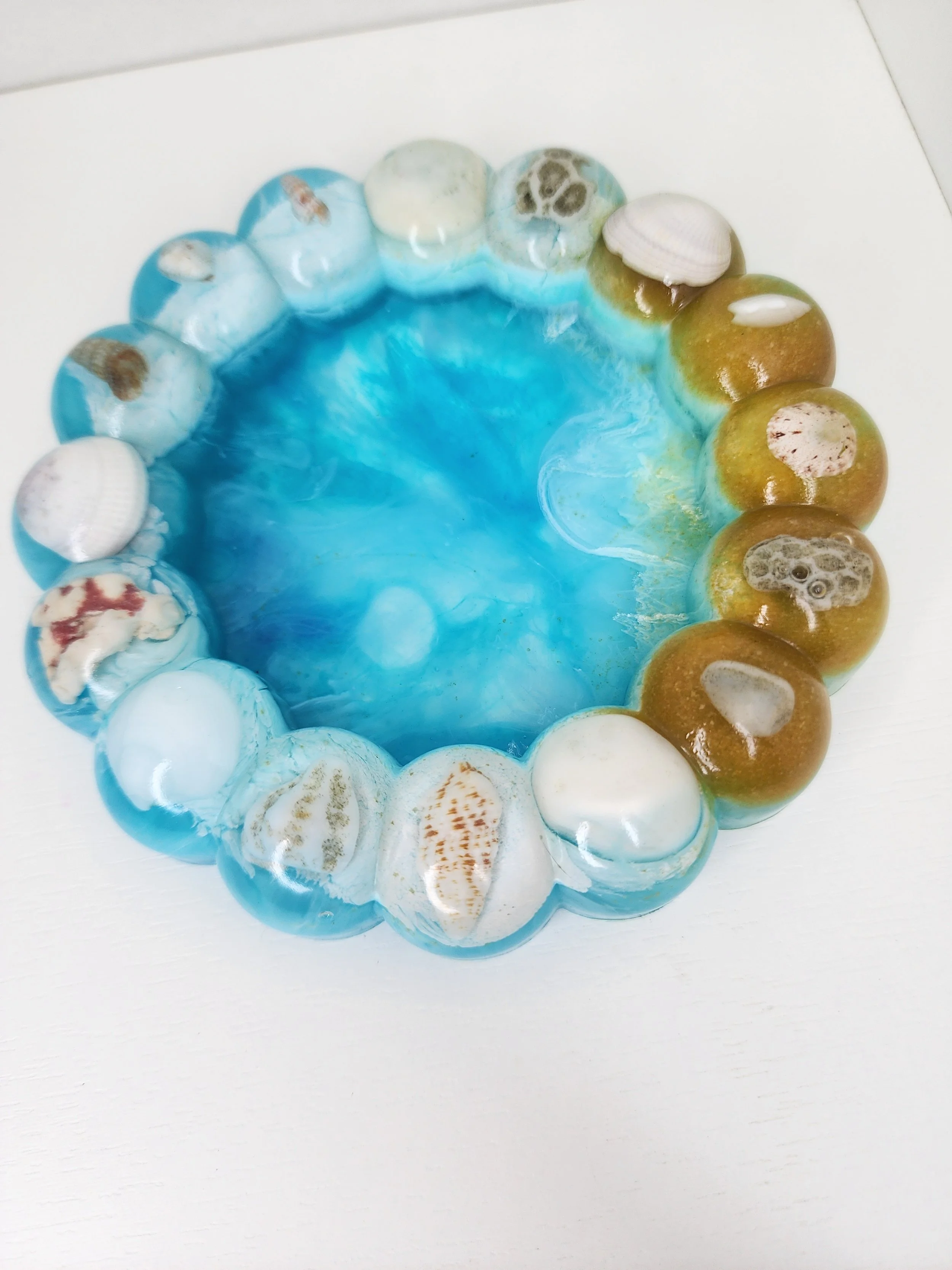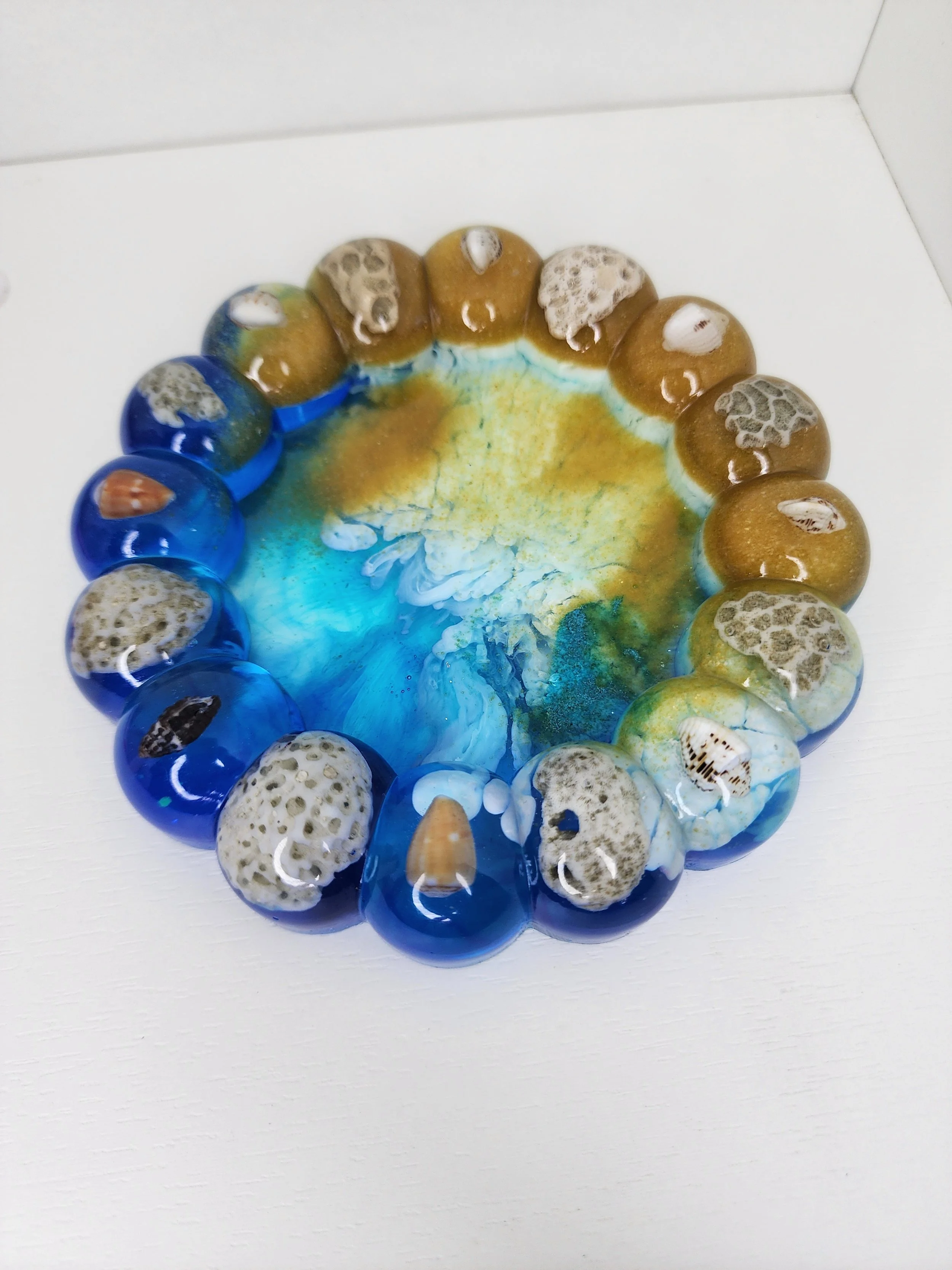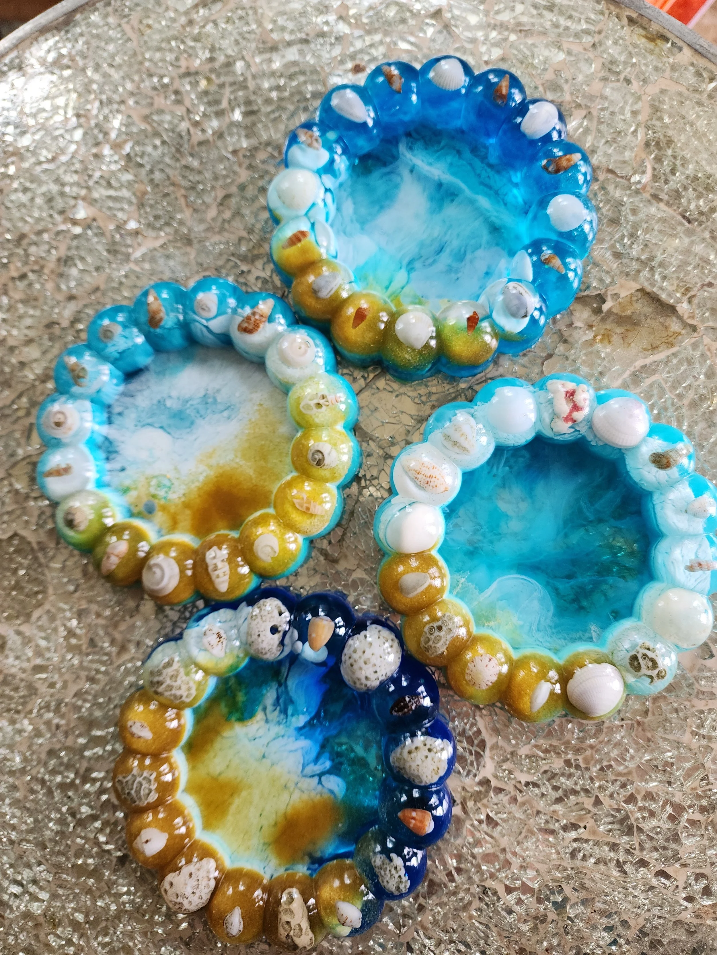 Each coasters holds unique shells and coral that she collected and are perfectly placed and preserved where she can see them safely forever and use them daily. Each coaster is completely unique, yet create a perfect set.