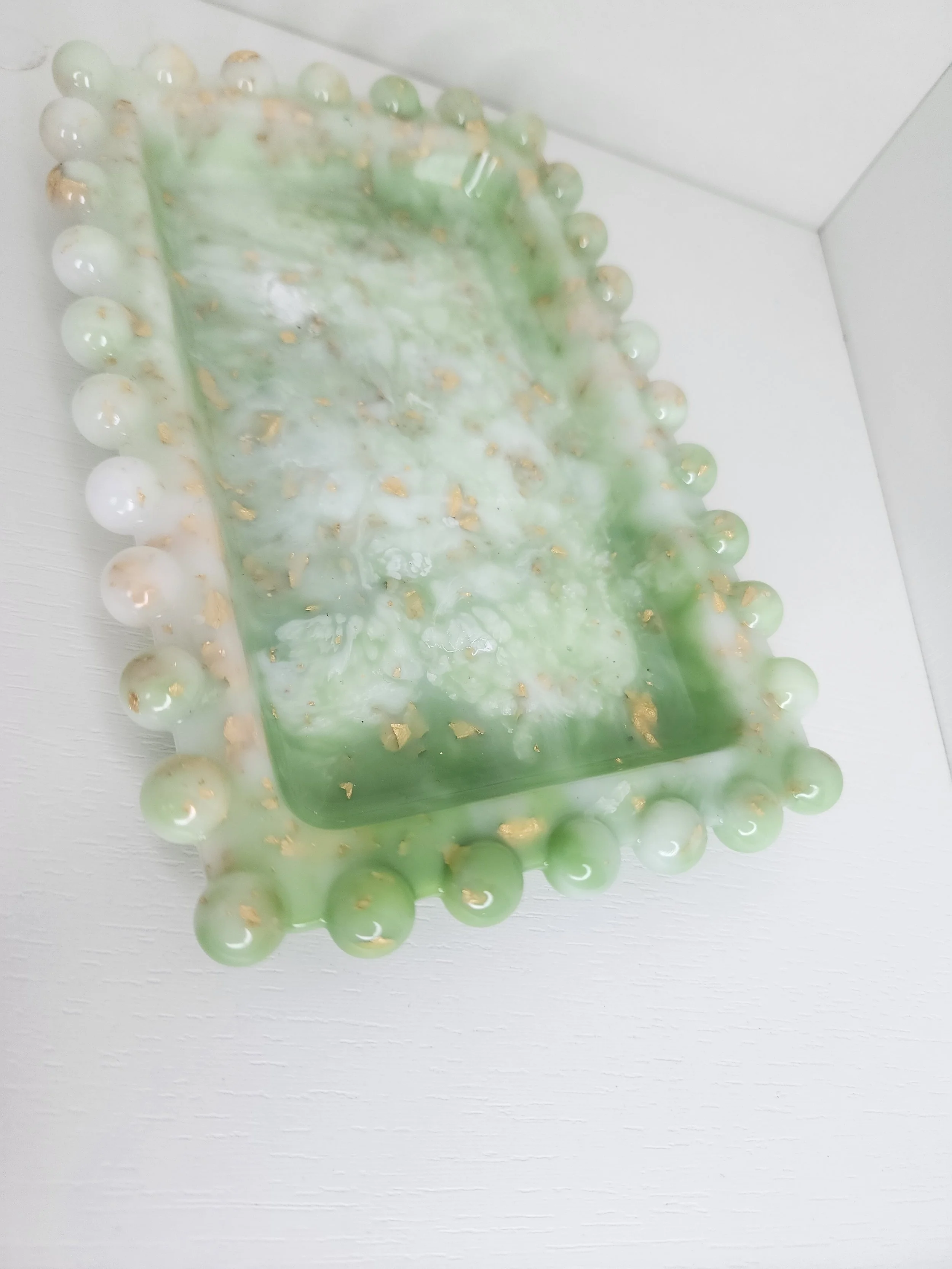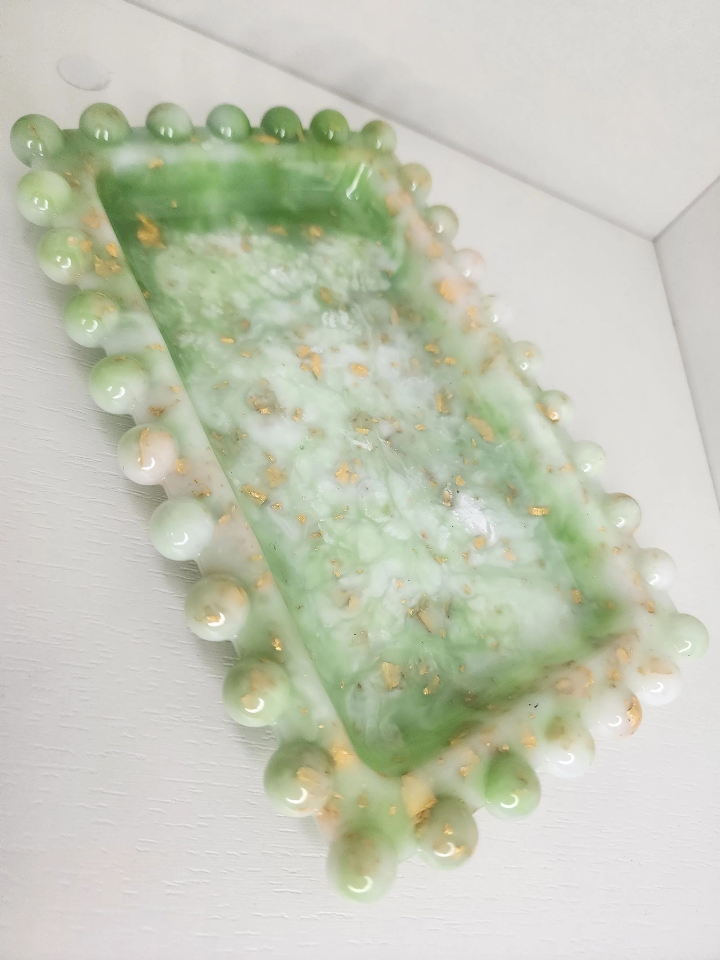 This design is great as a rolling tray, trinket dish, catch all, soap dish, or any other use you could have for this bubbly and unique design, This custom one incorporated a marbled olive green and gold fleck design that ended up being EXACTLY what the client wanted! I love when custom orders bring your vision to life!