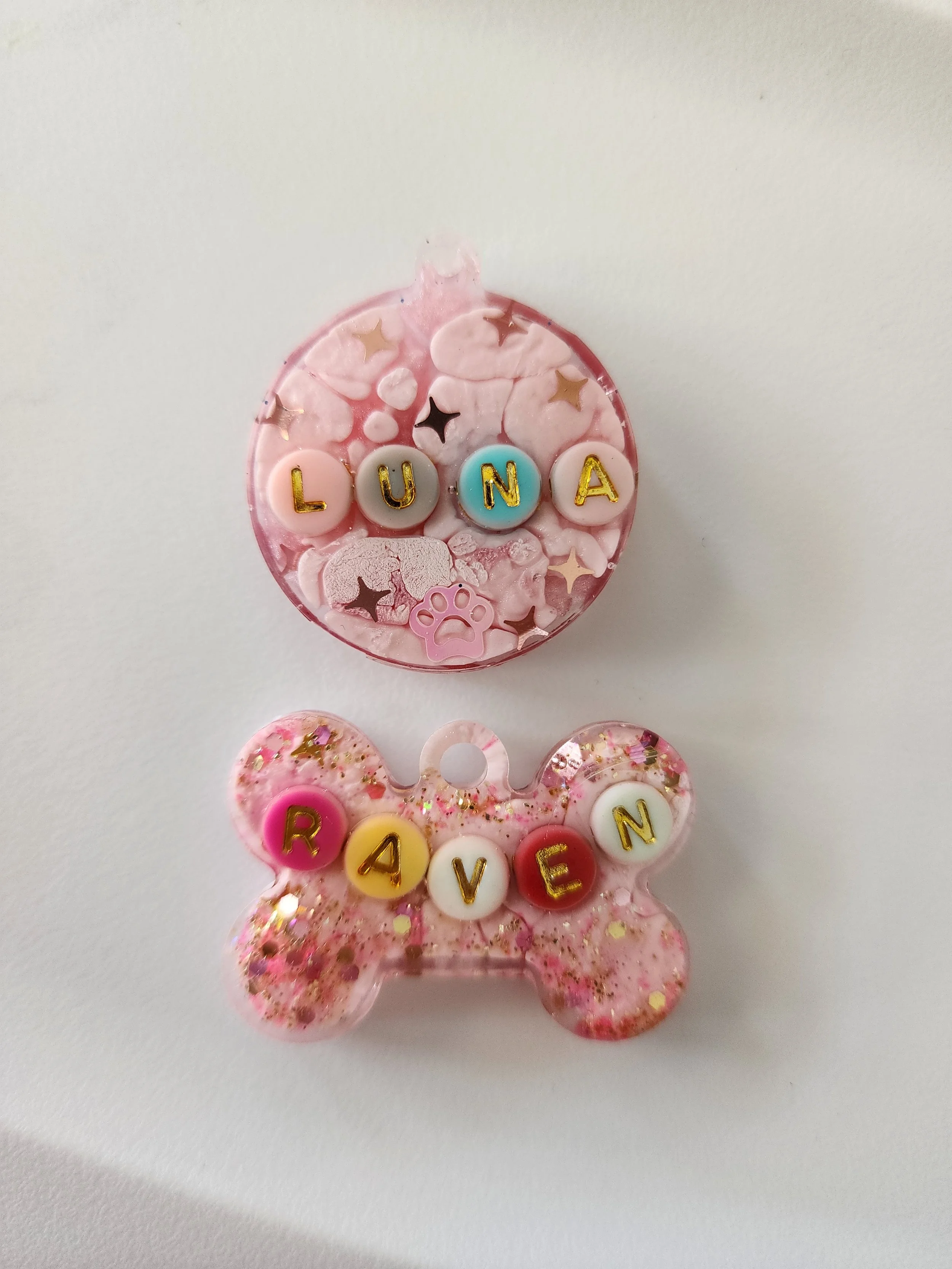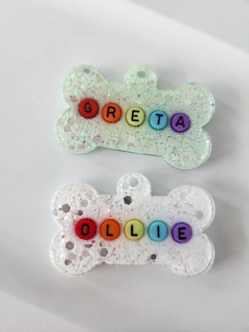 Photo 1: Creating these custom pet name tags for a friend as a gift to her fur-babies on their Adoption anniversary was so special! Rainbow bead letters and lots of glitter to make these two pups shine!